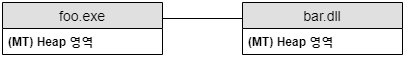 MT 옵션 설정 시 각 실행파일에 CRT 힙 메모리가 모두 생성됩니다. 그래서 아래 그림의 foo.exe에서 할당한 힙 메모리를 bar.dll에서 해제한다면, 메모리의 Access Violation 에러가 발생하게 됩니다.